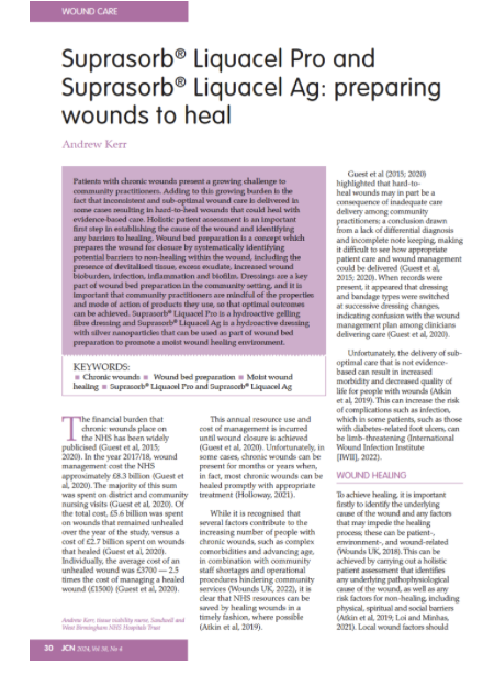 Kerr A (2024) Suprasorb Liquacel Pro and Suprasorb Liquacel Ag: preparing wounds to heal. Journal of Community Nursing, Vol 38, No 4