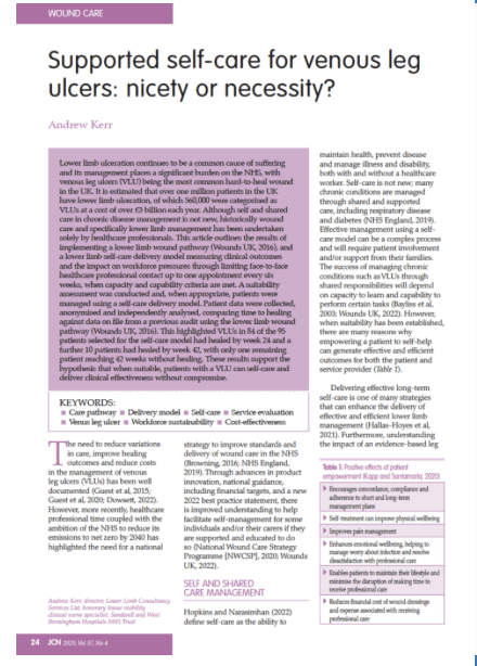 Kerr A (2023) Supported Self-care for venous leg ulcers: nicety or necessity? Journal of Community Nursing. Vol 37, No 4