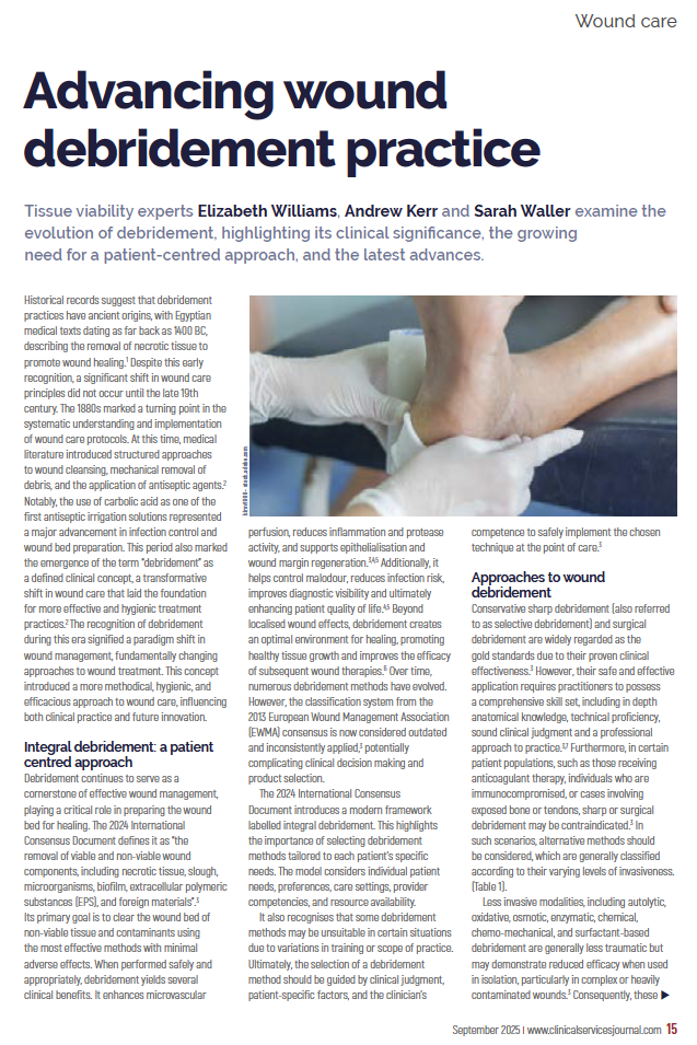 Williams E, Kerr A, Waller S (2025) Advancing wound debridement practice. Clinical Services Journal. Vol 24 No 9